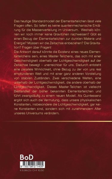 Das heutige Standardmodell der Elementarteilchen lässt viele Fragen offen. So liefert es keine quantenmechanische Erklärung für die Massenverteilung im Universum. Weshalb können wir noch immer keine Gravitonen nachweisen? Gibt es einen Bezug der Elementarteilchen zur dunklen Materie und Energie? Müssen wir die Zeitachse einbeziehen? Die Gravitation? Fragen über Fragen!Die Antwort darauf könnte die Existenz eines neues Elementarteilchens sein, eines Master-Teilchens, das sich mit einer Geschwindigkeit oberhalb der Lichtgeschwindigkeit auf der Zeitachse bewegt - unerreichbar für uns. Dadurch entsteht eine parallele Wirklichkeit, ohne Bezug zu der von uns real empfundenen Welt und mit einer ganz anderen Vorstellung von stabilen Zuständen. Zwei verschiedene Welten, eine unterhalb der Lichtgeschwindigkeit, die andere oberhalb der Lichtgeschwindigkeit. Dieses Master-Teilchen ist vielleicht Bestandteil der bisher bekannten Elementarteilchen und führt zwangsläufig zu einem neuen Modell.Als Quintessenz ergibt sich auch die Vermutung, dass unsere physikalischen Konstanten, insbesondere die Lichtgeschwindigkeit, gar keine Konstanten sind, sondern sich mit zunehmendem Alter unseres Universums verändern.