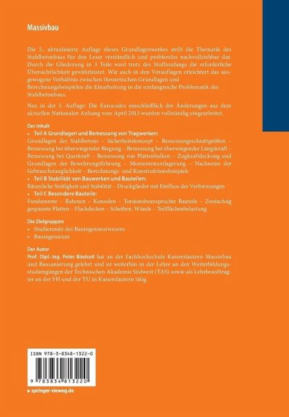 Die 5., aktualisierte Auflage dieses Grundlagenwerkes stellt die Thematik des Stahlbetonbaus für den Leser verständlich und problemlos nachvollziehbar dar. Durch die Gliederung in 3 Teile wird trotz des Stoffumfangs die erforderliche Übersichtlichkeit gewährleistet. Wie auch in den Vorauflagen erleichtert das ausgewogene Verhältnis zwischen theoretischen Grundlagen und Berechnungsbeispielen die Einarbeitung in die umfangreiche Problematik des Stahlbetonbaus.