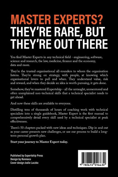 Do you have a complex technical job, like a software developer, scientist, lawyer, engineer, policy writer, economist or medical researcher? Master Expert is your guide to every business skill you need to succeed. 740 pages and 50 chapters of toolkits, ideas, checklists, and new processes to help you surmount every one of the challenges faced by senior technical specialists: How do I pitch my ideas to make sense commercially and strategically? How do I understand my organisation's commercial context? How do I prioritise and engage stakeholders? How do I recalibrate failing relationships? How do I coach and delegate, and make my expertise understood by non-technical colleagues? How do I manage upward, talk to boards, and convince doubters? How do I manage my energy, workload and priorities day to day? How do I get better at presenting, intelligence gathering and networking? How do I understand where my skills are weak, and how to plan to improve them? Why Master Expert? It's time technical specialists like yourself got the same deal as managers. From the very first day a new manager starts work, they're given a LOT of help. A career ladder. Appraisals, Mentoring. Networking. Capability frameworks. Support, connections - they're trained to deal with whatever business problems come along. Technical people don't get that kind of support. It's time they did. Master Expert details how to evaluate the performance of technical specialists, and includes a capability framework to understand your own, or your team's, progress toward Master Expert status. The authors, Alistair Gordon and Dominic Johnson, have been coaching developers, scientists, lawyers, engineers, policy writers, economists, medical researchers and other technical specialists for close to ten years now, and this book distils everything they've learned. Learn more at expertship.com