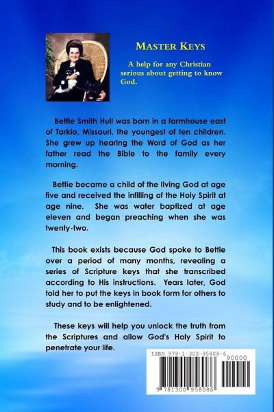 God spoke to Bettie Hull over a period of many months, revealing a series of scripture keys that she transcribed according to His instructions. Years later, God told her to put the keys in book form for others to study and to be enlightened. These keys will help you unlock the truth from the Scriptures and allow God's Holy Spirit to penetrate your life. "Just keep your eyes on Me and do not be afraid. I will keep those who trust Me to do so on that day. The evil day is coming when many will fail the test. Some will needlessly perish. They have My Holy Spirit, but they aren't allowing Him to lead them. They are going to be like the foolish virgins. All they needed was extra oil, and they didn't take it. Everyone is going to need extra oil. All will be tested. Don't rely on your own wit or power to keep you. You must have My Holy Spirit to show you the place of shelter I have for you. He will call My people out to follow Him. If you're not listening now, you won't listen then. Just do whatever He tells you."