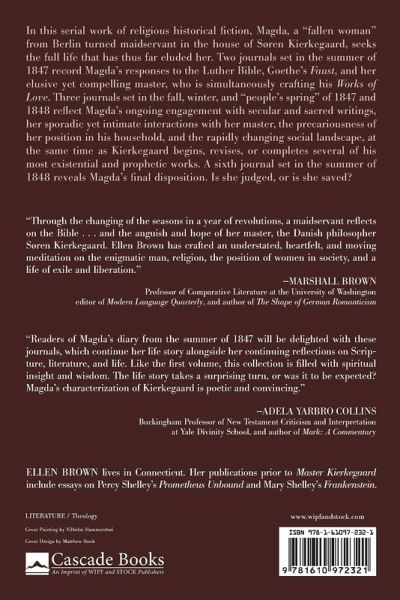 In this serial work of religious historical fiction, Magda, a "fallen woman" from Berlin turned maidservant in the house of Soren Kierkegaard, seeks the full life that has thus far eluded her. Two journals set in the summer of 1847 record Magda's responses to the Luther Bible, Goethe's Faust, and her elusive yet compelling master, who is simultaneously crafting his Works of Love. Three journals set in the fall, winter, and "people's spring" of 1847 and 1848 reflect Magda's ongoing engagement with secular and sacred writings, her sporadic yet intimate interactions with her master, the precariousness of her position in his household, and the rapidly changing social landscape, at the same time as Kierkegaard begins, revises, or completes several of his most existential and prophetic works. A sixth journal set in the summer of 1848 reveals Magda's final disposition. Is she judged, or is she saved?