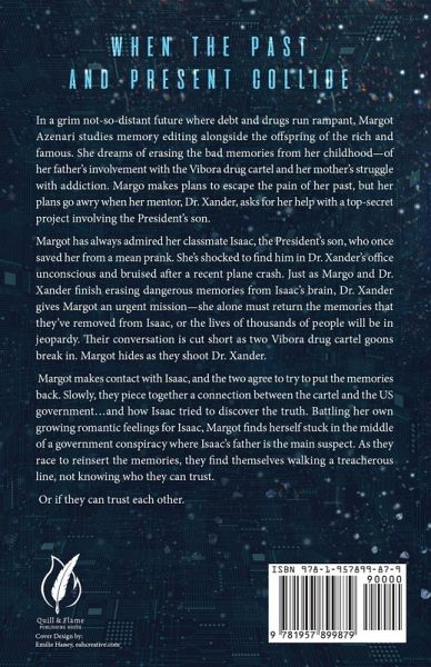 In a grim not-so-distant future where debt and drugs run rampant, Margot Azenari studies memory editing alongside the offspring of the rich and famous. She dreams of erasing the bad memories from her childhood-of her father's involvement with the Vibora drug cartel and her mother's struggle with addiction. Margo makes plans to escape the pain of her past, but her plans go awry when her mentor, Dr. Xander, asks for her help with a top-secret project involving the President's son. Margot has always admired her classmate Isaac, the President's son, who once saved her from a mean prank. She's shocked to find him in Dr. Xander's office unconscious and bruised after a recent plane crash. Just as Margot and Dr. Xander finish erasing dangerous memories from Isaac's brain, Dr. Xander gives Margot an urgent mission-she alone must return the memories that they've removed from Isaac, or the lives of thousands of people will be in jeopardy. Their conversation is cut short as two Vibora drug cartel goons break in. Margot hides as they shoot Dr. Xander. Margot makes contact with Isaac, and the two agree to try to put the memories back. Slowly, they piece together a connection between the cartel and the US government...and how Isaac tried to discover the truth. Battling her own growing romantic feelings for Isaac, Margot finds herself stuck in the middle of a government conspiracy where Isaac's father is the main suspect. As they race to reinsert the memories, they find themselves walking a treacherous line, not knowing who they can trust. Or if they can trust each other.