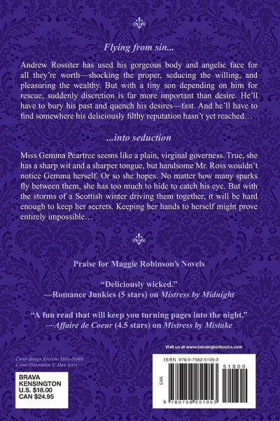Flying from sin. . . Andrew Rossiter has used his gorgeous body and angelic face for all they're worth--shocking the proper, seducing the willing, and pleasuring the wealthy. But with a tiny son depending on him for rescue, suddenly discretion is far more important than desire. He'll have to bury his past and quench his desires--fast. And he'll have to find somewhere his deliciously filthy reputation hasn't yet reached. . . ..into seduction Miss Gemma Peartree seems like a plain, virginal governess. True, she has a sharp wit and a sharper tongue, but handsome Mr. Ross wouldn't notice Gemma herself. Or so she hopes. No matter how many sparks fly between them, she has too much to hide to catch his eye. But with the storms of a Scottish winter driving them together, it will be hard enough to keep her secrets. Keeping her hands to herself might prove entirely impossible. . . Praise for Maggie Robinson's Novels "Deliciously wicked." --Romance Junkies (5 stars) on Mistress by Midnight "A fun read that will keep you turning pages into the night." --Affaire de Coeur (4.5 stars) on Mistress by Mistake