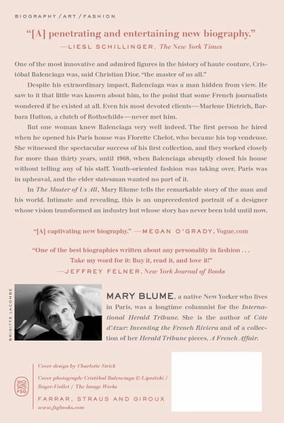 "A sparkling life of the monumental fashion designer Cristobal Balenciaga. When Cristobal Balenciaga died in 1972, the news hit the front page of The New York Times. One of the most innovative and admired figures in the history of haute couture, Balenciaga said that he was the only designer who dared to do as he liked. He was, said Christian Dior, "the master of us all." But despite his extraordinary impact, he was a man hidden from view. Unlike today's celebrity designers, he saw to it that little was known about him, to the point that some French journalists wondered if he existed at all. Even his most notable and devoted clients never met him. But one woman knew Balenciaga better than anyone else. The first person he hired when he opened his Paris house, furnished with only a table and a chair, Florette Chelot became his top vendeuse--as much an adviser as a saleswoman. She witnessed the spectacular success of his first collection, and they worked closely for thirty years--until 1968, when Balenciaga abruptly closed his house without telling any of his staff. Youth-oriented fashion was taking over, Paris was in upheaval, and the elder statesman wanted no part of it. In The Master of Us All, Mary Blume tells the remarkable story of the man andhis house through the eyes of the woman who knew him best. Intimate and revealing, this is an unprecedented portrait of a designer whose vision transformed an industry, but whose story has never been told until now.