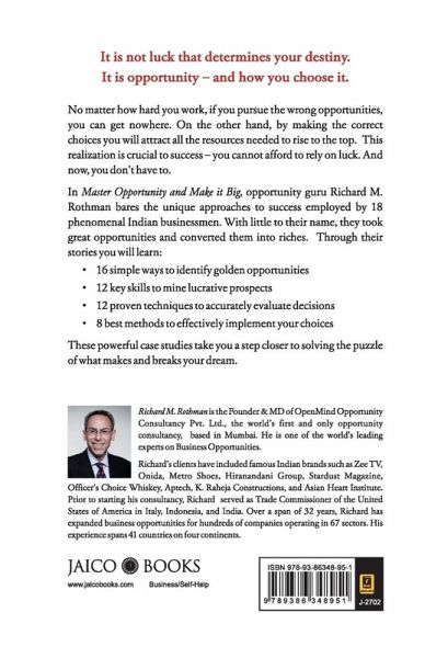 It is not luck that determines your destiny. It is opportunity - and how you choose it. No matter how hard you work, if you pursue the wrong opportunities, you can get nowhere. On the other hand, by making the correct choices you will attract all the resources needed to rise to the top. This realization is crucial to success - you cannot afford to rely on luck. And now, you don't have to. In Master Opportunity and Make it Big, opportunity guru Richard M. Rothman bares the unique approaches to success employed by 18 phenomenal Indian businessmen. With little to their name, they took great opportunities and converted them into riches. Through their stories you will learn: ¿ 16 simple ways to identify golden opportunities ¿ 12 key skills to mine lucrative prospects ¿ 12 proven techniques to accurately evaluate decisions ¿ 8 best methods to effectively implement your choices These powerful case studies take you a step closer to solving the puzzle of what makes and breaks your dream. Richard M. Rothman is the Founder & MD of OpenMind Opportunity Consultancy Pvt. Ltd., the world's first and only opportunity consultancy, based in Mumbai. He is one of the world's leading experts on Business Opportunities. Richard's clients have included famous Indian brands such as Zee TV, Onida, Metro Shoes, Hiranandani Group, Stardust Magazine, Officer's Choice Whiskey, Aptech, K. Raheja Constructions, and Asian Heart Institute. Prior to starting his consultancy, Richard served as Trade Commissioner of the United States of America in Italy, Indonesia, and India. Over a span of 32 years, Richard has expanded business opportunities for hundreds of companies operating in 67 sectors. His experience spans 41 countries on four continents.