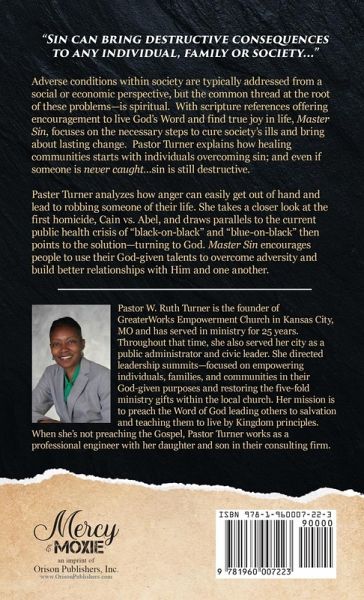 "Sin can bring destructive consequences to any individual, family or society..." Adverse conditions within society are typically addressed from a social or economic perspective, but the common thread at the root of these problems-is spiritual. With scripture references offering encouragement to live God's Word and find true joy in life, Master Sin, focuses on the necessary steps to cure society's ills and bring about lasting change. Pastor Turner explains how healing communities starts with individuals overcoming sin; and even if someone is never caught...sin is still destructive. Paster Turner analyzes how anger can easily get out of hand and lead to robbing someone of their life. She takes a closer look at the first homicide, Cain vs. Abel, and draws parallels to the current public health crisis of "black-on-black" and "blue-on-black" then points to the solution-turning to God. Master Sin encourages people to use their God-given talents to overcome adversity and build better relationships with Him and one another.