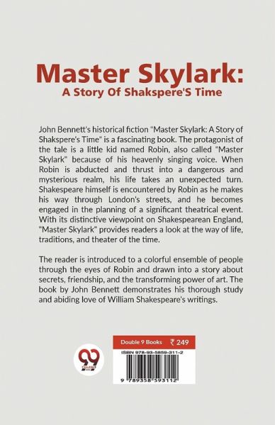 John Bennett's historical fiction "Master Skylark: A Story of Shakspere's Time" is a fascinating book. The protagonist of the tale is a little kid named Robin, also called "Master Skylark" because of his heavenly singing voice. When Robin is abducted and thrust into a dangerous and mysterious realm, his life takes an unexpected turn. Shakespeare himself is encountered by Robin as he makes his way through London's streets, and he becomes engaged in the planning of a significant theatrical event. With its distinctive viewpoint on Shakespearean England, "Master Skylark" provides readers a look at the way of life, traditions, and theater of the time. The reader is introduced to a colorful ensemble of people through the eyes of Robin and drawn into a story about secrets, friendship, and the transforming power of art. The book by John Bennett demonstrates his thorough study and abiding love of William Shakespeare's writings.