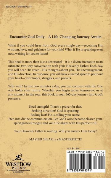Encounter God Daily-A Life-Changing Journey Awaits What if you could hear from God every single day-receiving His wisdom, love, and guidance for your life? What if He is speaking even now, waiting for you to listen? is book is more than just a devotional-it is a divine invitation to an intimate, two-way conversation with your Heavenly Father. Each day, you will hear His voice-His thoughts about you, His encouragement, and His direction. In response, you will have a sacred space to pour out your heart-your hopes, struggles, and prayers. Why wait? In just two minutes a day, you can connect with the One who holds your future. Whether you begin today, tomorrow, or at any moment in the year, this book is your 365-day journey into God's presence. Need strength? ere's a prayer for that. Seeking direction? God is speaking. Feeling lost? He is calling your name. Step into divine communication. Let God's voice become clearer, your spirit grows stronger, and your life aligns with His perfect will. Your Heavenly Father is waiting. Will you answer Him today? MASTER SPEAK is a MASTERPIECE!