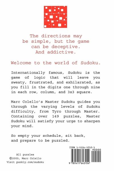 Master Sudoku guides you through varying levels of Sudoku difficulty, from Tyro through Master. Containing over 149 puzzles, Master Sudoku will satisfy your urge to sharpen your mind. So empty your schedule, sit back, and prepare to be puzzled.