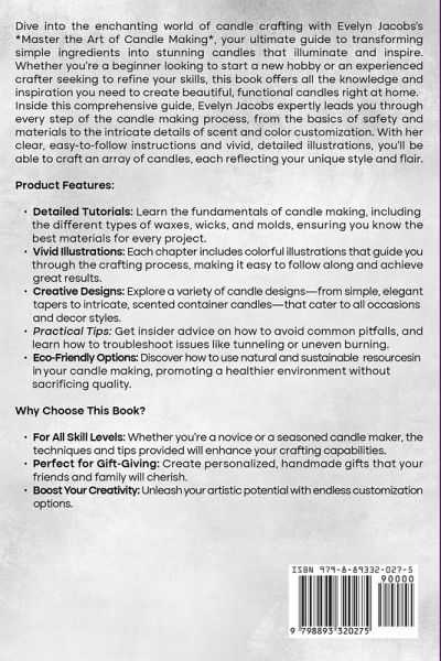 Dive into the enchanting world of candle crafting with Evelyn Jacobs's *Master the Art of Candle Making*, your ultimate guide to transforming simple ingredients into stunning candles that illuminate and inspire. Whether you're a beginner looking to start a new hobby or an experienced crafter seeking to refine your skills, this book offers all the knowledge and inspiration you need to create beautiful, functional candles right at home. Inside this comprehensive guide, Evelyn Jacobs expertly leads you through every step of the candle making process, from the basics of safety and materials to the intricate details of scent and color customization. With her clear, easy-to-follow instructions and vivid, detailed illustrations, you'll be able to craft an array of candles, each reflecting your unique style and flair. Product Features:Detailed Tutorials: Learn the fundamentals of candle making, including the different types of waxes, wicks, and molds, ensuring you know the best materials for every project. Vivid Illustrations: Each chapter includes colorful illustrations that guide you through the crafting process, making it easy to follow along and achieve great results. Creative Designs: Explore a variety of candle designs-from simple, elegant tapers to intricate, scented container candles-that cater to all occasions and decor styles. Practical Tips: Get insider advice on how to avoid common pitfalls and learn how to troubleshoot issues like tunneling or uneven burning. Eco-Friendly Options: Discover how to use natural and sustainable resources in your candle making, promoting a healthier environment without sacrificing quality. Why Choose This Book?For All Skill Levels: Whether you're a novice or a seasoned candle maker, the techniques and tips provided will enhance your crafting capabilities. Perfect for Gift-Giving: Create personalized, handmade gifts that your friends and family will cherish. Boost Your Creativity: Unleash your artistic potential with endless customization options.
