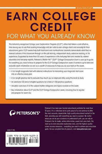 Passing the CLEP(R) College Composition exam is a breeze with Peterson's(R) Master the CLEP(R) College Composition Exam. This handy guide provides a clear and succinct overview of everything you need to know to do well on the CLEP College Composition Exam. It contains pre- and post-tests to gauge your skills as well as subject reviews covering each of the four content categories (Conventions of Standard Written English, Revision Skills, Ability to Use Source Materials, and Rhetorical Analysis) as well as the required essay section. Whether you're a whiz at writing or just looking to save money on a required course, this book can help you optimize your test prep so you can make the most of your CLEP College Composition test.
