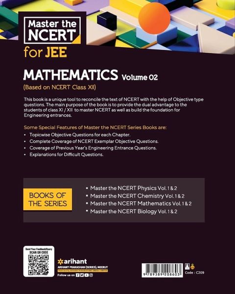 With the increase in questions framed aligning to the NCERT sources, the Series "MASTER THE NCERT" has been framed in a way to grasp each concept of NCERT for both School and Competitive exams. The new edition of "MASTER THE NCERT for JEE- MATHEMATICS VOLUME 02" has been compiled to provide dual advantage for class XI/XII students. This book covers 13 chapters in a conscious manner to get complete conceptual knowledge. Questions in each chapter are framed in two categories that are further divided into 2 levels. While Level 1 questions are related to learning concepts, the questions of Level II are framed for exam pattern exposure and practice. The second category includes miscellaneous questions proving to be a perfect study resource to build the foundation over Engineering entrances. This book incorporates: 1. Complete coverage of the syllabus 2. Questions are framed in two categories 3. Category 1 has topically divided questions into two levels 4. Level 1 has Questions from NCERT with solutions 5. Level 2 Questions provide insight of competitions 6. Category 2 has Miscellaneous questions for exam practice 7. Previous Years' Engineering Entrance Questions TABLE OF CONTENT Relations and Functions, Inverse Trigonometric Functions, Matrices, Determinants, Continuity and Differentiability, Application of Derivatives, Integrals, Application of Integrals, Differential Equations, Vector Algebra, Three Dimensional Geometry, Linear Programming, Probability, JEE Questions (2022-20)