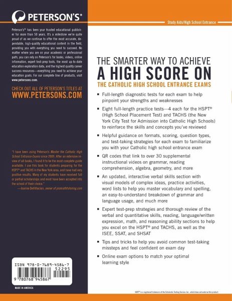 "Peterson'sª Master the" Catholic High School Entrance Exams, 26th edition, is the comprehensive test-prep book for scoring high on Catholic high school entrance exams. This guide covers all test formats, test scoring, subject review, and types of questions for the most popular parochial school placement tests--the High School Placement Test (HSPTª) and the New York City Test for Admission into Catholic High Schools (TACHS). Step-by-step coaching for each type of question on the exams and numerous test-taking strategies allow students to feel confident in their abilities when test day arrives. Targeted reviews and up-to-date test information makes Peterson'sª Master the Catholic High School Entrance Exams the ideal study guide for students looking to get into parochial school. 10 full-length practice tests--4 in the book and 1 online EACH for the HSPTª and TACHS--ALL with detailed answer explanations. Diagnostic test for each exam to help determine strengths and weaknesses. OVER 3,000 practice questions to help you earn your best possible score on the HSPTª, TACHS, SSAT, ISEE, CHSEE, and more. Bonus supplemental video content to walk you through difficult concepts found in the verbal, math, and ability sections of the exams. Evidenced-based learning strategies, study skills, and test-taking tips to help you get the most out of your study sessions. Bonus word list plus a list of synonyms and antonyms to help boost your test-prep confidence on the language arts sections of the exams. Expert test-prep strategies and thorough review of the verbal, math, reasoning, and quantitative sections. Easy-to-use self-evaluation tools to track progress and set a timetable for study"--