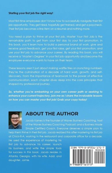 Starting your first job the right way! Most first-time employees don't know how to successfully navigate their first job opportunity. They get hired, hopefully get trained, and get a paycheck. Their first job becomes a line item on a résumé and nothing more. You need a plan to thrive at your first job. Master Your First Job is the remarkable path to get from your first day to your first promotion. In this book, you'll learn how to build a personal brand at work, give and receive good feedback, get your first raise, get your first promotion, and use your first job to advance your career. By reading this book, you will receive a "Master's Degree" in your first job opportunity and become the employee everyone wants to have on their team. These lessons aren't just about making waffle fries or crunching numbers; they're the culmination of a decade of hard work, growth, and self-discovery. From the importance of teamwork to the power of effective communication, each chapter dives deep into the core principles that shaped my professional journey. So, whether you're embarking on your own career path or seeking to enhance your current trajectory, join me as I share the invaluable lessons on how you can master your first job! Grab your copy today!