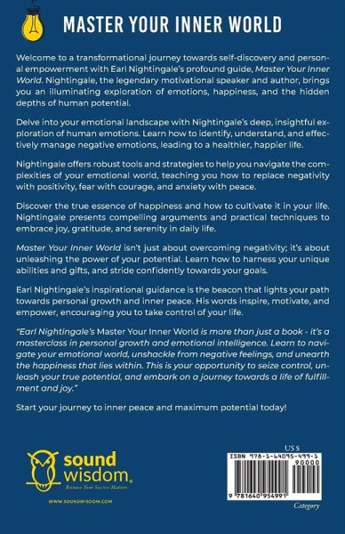 Welcome to a transformational journey towards self-discovery and personal empowerment with Earl Nightingale's profound guide, Master Your Inner World . Nightingale, the legendary motivational speaker and author, brings you an illuminating exploration of emotions, happiness, and the hidden depths of human potential. Delve into your emotional landscape with Nightingale's deep, insightful exploration of human emotions. Learn how to identify, understand, and effectively manage negative emotions, leading to a healthier, happier life. Nightingale offers robust tools and strategies to help you navigate the complexities of your emotional world, teaching you how to replace negativity with positivity, fear with courage, and anxiety with peace. Discover the true essence of happiness and how to cultivate it in your life. Nightingale presents compelling arguments and practical techniques to embrace joy, gratitude, and serenity in daily life. Master Your Inner World isn't just about overcoming negativity; it's about unleashing the power of your potential. Learn how to harness your unique abilities and gifts, and stride confidently towards your goals. Earl Nightingale's inspirational guidance is the beacon that lights your path towards personal growth and inner peace. His words inspire, motivate, and empower, encouraging you to take control of your life. "Earl Nightingale's Master Your Inner World is more than just a book - it's a masterclass in personal growth and emotional intelligence. Learn to navigate your emotional world, unshackle from negative feelings, and unearth the happiness that lies within. This is your opportunity to seize control, unleash your true potential, and embark on a journey towards a life of fulfillment and joy." Start your journey to inner peace and maximum potential today!