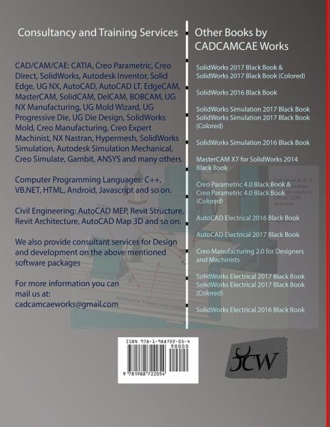 The Mastercam 2017 for SolidWorks Black Book is the second edition of our series on Mastercam for SolidWorks. With lots of additions and thorough review, we present a book to help professionals as well as learners in creating some of the most complex NC toolpaths. The book follows a step by step methodology. In this book, we have tried to give real-world examples with real challenges in designing. We have tried to reduce the gap between university use of Mastercam and industrial use of Mastercam. In this edition of book, we have included many new topics of Mastercam 2017 for SolidWorks like Stock management, Chuck & Tailstock control by NC, Feature Based Toolpaths, Surface Roughing Operations, Surface Finishing Operations, 3D High Speed Toolpaths, Toolpath Trimming and Nesting, and so on. There are about 60 topics newly added in this book which were not in the previous edition. The book covers almost all the information required by a learner to master Mastercam for SolidWorks. The book starts with basics of machining and ends at advanced topics like 3D High Speed Machining Toolpaths. Some of the salient features of this book are : In-Depth explanation of concepts Every new topic of this book starts with the explanation of the basic concepts. In this way, the user becomes capable of relating the things with real world. Topics Covered Every chapter starts with a list of topics being covered in that chapter. In this way, the user can easy find the topic of his/her interest easily. Instruction through illustration The instructions to perform any action are provided by maximum number of illustrations so that the user can perform the actions discussed in the book easily and effectively. There are about 650 small and large illustrations that make the learning process effective. Tutorial point of view At the end of concept's explanation, the tutorial make the understanding of users firm and long lasting. Almost each chapter of the book has tutorials that are real world projects. Moreover most of the tools in this book are discussed in the form of tutorials. Project Free projects and exercises are provided to students for practicing. For Faculty If you are a faculty member, then you can ask for video tutorials on any of the topic, exercise, tutorial, or concept. Discount is available on books at our website www.cadcamcaeworks.com
