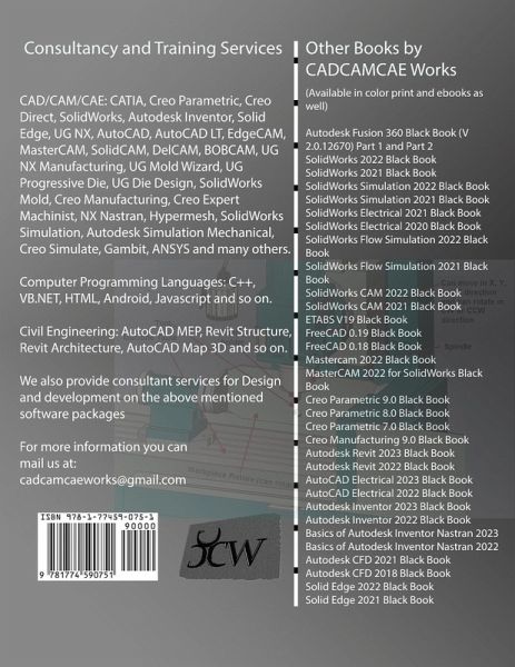 The Mastercam 2023 Black Book, the new, updated edition! is the 3rd edition of our series on Mastercam. The book is authored to help professionals as well as learners in creating some of the most complex NC toolpaths. The book follows a step-by-step methodology. In this book, we have tried to give real-world examples with real challenges in designing. We have tried to reduce the gap between university use of Mastercam and industrial use of Mastercam. The book covers almost all the information required by a learner to master Mastercam. The book starts with basics of machining and ends at advanced topics like Multiaxis Machining Toolpaths. This book covers Mastercam Designing tools, Milling Machine Tools and Lathe Machine tools. Some of the salient features of this book are: In-Depth explanation of concepts Every new topic of this book starts with the explanation of the basic concepts. In this way, the user becomes capable of relating the things with real world. Topics Covered Every chapter starts with a list of topics being covered in that chapter. In this way, the user can easy find the topic of his/her interest easily. Instruction through illustration The instructions to perform any action are provided by maximum number of illustrations so that the user can perform the actions discussed in the book easily and effectively. There are about 930 small and large illustrations that make the learning process effective. Tutorial point of view At the end of concept's explanation, tutorials make the understanding of user's firm and long lasting. Almost each chapter of the book related to machining has tutorials that are real world projects. Moreover, most of the tools in this book are discussed in the form of tutorials. For Faculty If you are a faculty member, then you can ask for video tutorials on any of the topic, exercise, tutorial, or concept. As faculty, you can register on our website to get electronic desk copies of our latest books, self-assessment, and solution of practical. Faculty resources are available in the Faculty Member page of our website once you login. Note that faculty registration approval is manual and it may take two days for approval before you can access the faculty website.