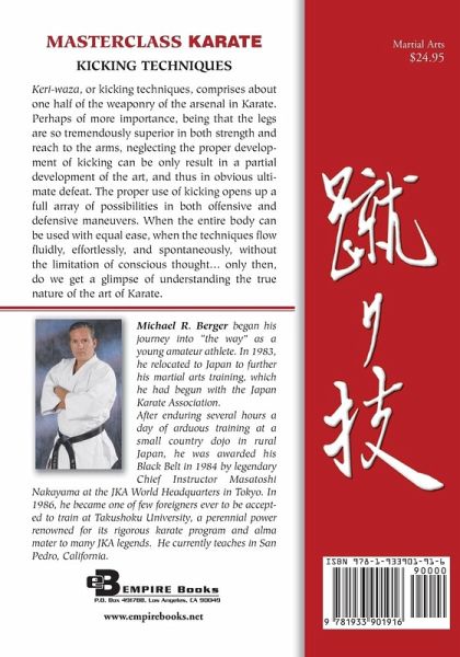 Keri-waza, or kicking techniques, comprise about half of the arsenal in karate. Perhaps of more importance, being that the legs are far superior in both strength and reach to the arms, neglecting the proper development of kicking can result only in a partial development of the art, and thus in obvious ultimate defeat. The proper use of kicking opens a full array of possibilities in both offensive and defensive maneuvers. When the entire body can be used with equal ease; when the techniques flow fluidly, effortlessly, and spontaneously, without the limitation of conscious thought…only then do…mehr