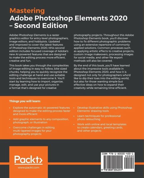 An example-driven guide to take your image editing skills from beginner to advanced using powerful Photoshop Elements tools and techniques in tandem with Adobe’s latest AI technology Key Features Updated to the latest version of Photoshop Elements 2020 with focused coverage on Adobe’s latest AI technology Organize, search, and keep track of an ever-increasing number of images and videos using expert practices Discover common solutions to a wide range of photographic and image-editing problems Book Description Adobe Photoshop Elements is a raster graphics editor for entry-level photographers, image editors, and hobbyists. Updated and improved to cover the latest features of Photoshop Elements 2020, this second edition includes focused coverage of Adobe's new AI-powered features that are designed to make the editing process more efficient, creative and fun. This book takes you through the complexities of image editing in easy-to-follow, bite-sized chunks, helping you to quickly recognize the editing challenge at hand and use suitable tools and techniques to overcome it. You’ll start by learning how to import, organize, manage, edit, and use your pictures in a format that’s designed for creative photography projects. Throughout this Adobe Photoshop Elements book, you'll discover how to fix different photographic problems using an extensive repertoire of commonly applied solutions. Common processes such as applying artistic effects to creative projects, custom image makeovers, processing images for social media, and other file export methods will also be covered. By the end of this book, you’ll have learned about the impressive tools available in Photoshop Elements 2020, and how it is designed not only for photographers who’d like to dip their toes into the editing world, but also for those wanting simple but effective ideas on how to expand their creativity while remaining time-efficient. What you will learn Explore the automatic AI-powered features designed to make the editing process faster and more efficient Add graphic elements to any composition, photograph, or illustration Overcome challenges in editing multi-layered images for your photography projects Develop illustrative skills using Photoshop Elements' drawing tools Learn techniques for professional photo retouching Work with online and local templates to create calendars, greeting cards, and other projects Who this book is for This book is for creative and enthusiastic photographers with elementary experience in photo editing. If you are looking to organize your picture collection and take control of post-processing requirements, you’ll find this book useful. Though not necessary, photography skills alongside basic photo editing knowledge will help you to get the most out of this book.