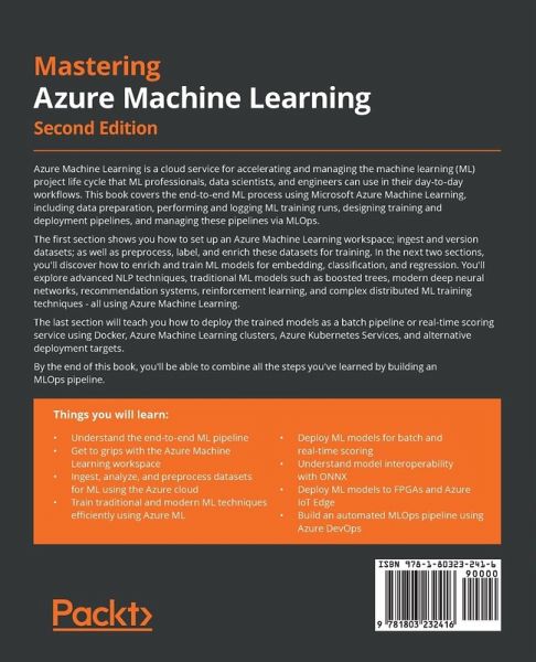 Supercharge and automate your deployments to Azure Machine Learning clusters and Azure Kubernetes Service using Azure Machine Learning services Key Features:Implement end-to-end machine learning pipelines on Azure Train deep learning models using Azure compute infrastructure Deploy machine learning models using MLOps Book Description: Azure Machine Learning is a cloud service for accelerating and managing the machine learning (ML) project life cycle that ML professionals, data scientists, and engineers can use in their day-to-day workflows. This book covers the end-to-end ML process using Microsoft Azure Machine Learning, including data preparation, performing and logging ML training runs, designing training and deployment pipelines, and managing these pipelines via MLOps. The first section shows you how to set up an Azure Machine Learning workspace; ingest and version datasets; as well as preprocess, label, and enrich these datasets for training. In the next two sections, you'll discover how to enrich and train ML models for embedding, classification, and regression. You'll explore advanced NLP techniques, traditional ML models such as boosted trees, modern deep neural networks, recommendation systems, reinforcement learning, and complex distributed ML training techniques - all using Azure Machine Learning. The last section will teach you how to deploy the trained models as a batch pipeline or real-time scoring service using Docker, Azure Machine Learning clusters, Azure Kubernetes Services, and alternative deployment targets. By the end of this book, you'll be able to combine all the steps you've learned by building an MLOps pipeline. What You Will Learn:Understand the end-to-end ML pipeline Get to grips with the Azure Machine Learning workspace Ingest, analyze, and preprocess datasets for ML using the Azure cloud Train traditional and modern ML techniques efficiently using Azure ML Deploy ML models for batch and real-time scoring Understand model interoperability with ONNX Deploy ML models to FPGAs and Azure IoT Edge Build an automated MLOps pipeline using Azure DevOps Who this book is for: This book is for machine learning engineers, data scientists, and machine learning developers who want to use the Microsoft Azure cloud to manage their datasets and machine learning experiments and build an enterprise-grade ML architecture using MLOps. This book will also help anyone interested in machine learning to explore important steps of the ML process and use Azure Machine Learning to support them, along with building powerful ML cloud applications. A basic understanding of Python and knowledge of machine learning are recommended.
