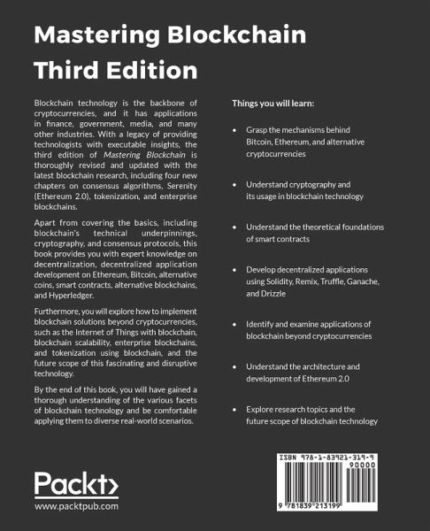 Mastering Blockchain, Third Edition is the blockchain bible to equip you with extensive knowledge of distributed ledgers, cryptocurrencies, smart contracts, consensus algorithms, cryptography and blockchain platforms such as Ethereum, Bitcoin, and many more.