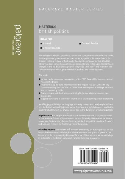 Containing all the information and analysis needed to understand the British system of Government and politics, Mastering British Politics is an essential text. This fifth edition has been fully revised and updated to reflect the results of and developments since the 2005 General Election.