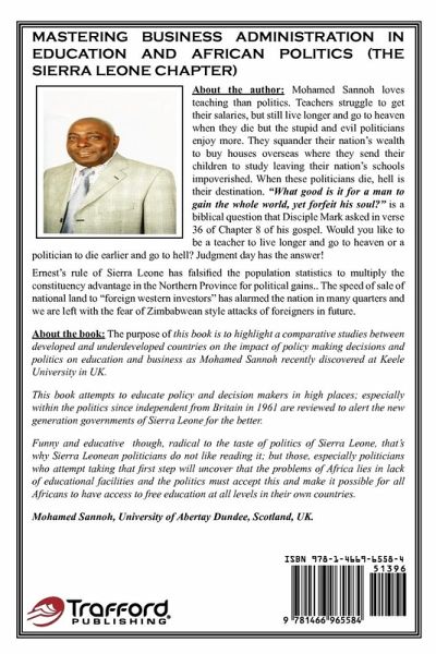 The purpose of this book is to highlight a comparative studies between developed and underdeveloped countries on the impact of policy making decisions and politics on education and business as Mohamed Sannoh recently discovered at Keele University in UK. Thorough analysis relating to tribalism, prolonged economic mismanagement by policy and decision makers in high places; especially within the politics since independent in 1961are reviewed to educate the new generation governments of Sierra Leone for the better. This book is funny and educative, though radical to the taste of politics of Sierra Leone and that's why Sierra Leonean politicians do not like reading it; but those who attempt taking that first step learn great joy to enjoy politics of change that we all look forward to.