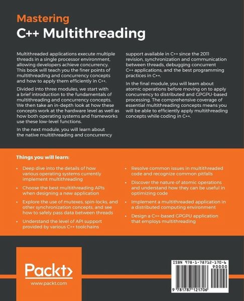 Master multithreading and concurrent processing with C++ Key FeaturesDelve into the fundamentals of multithreading and concurrency and find out how to implement them Explore atomic operations to optimize code performance Apply concurrency to both distributed computing and GPGPU processing Book Description Multithreaded applications execute multiple threads in a single processor environment, allowing developers achieve concurrency. This book will teach you the finer points of multithreading and concurrency concepts and how to apply them efficiently in C++. Divided into three modules, we start with a brief introduction to the fundamentals of multithreading and concurrency concepts. We then take an in-depth look at how these concepts work at the hardware-level as well as how both operating systems and frameworks use these low-level functions. In the next module, you will learn about the native multithreading and concurrency support available in C++ since the 2011 revision, synchronization and communication between threads, debugging concurrent C++ applications, and the best programming practices in C++. In the final module, you will learn about atomic operations before moving on to apply concurrency to distributed and GPGPU-based processing. The comprehensive coverage of essential multithreading concepts means you will be able to efficiently apply multithreading concepts while coding in C++. What you will learnDeep dive into the details of the how various operating systems currently implement multithreading Choose the best multithreading APIs when designing a new application Explore the use of mutexes, spin-locks, and other synchronization concepts and see how to safely pass data between threads Understand the level of API support provided by various C++ toolchains Resolve common issues in multithreaded code and recognize common pitfalls using tools such as Memcheck, CacheGrind, DRD, Helgrind, and more Discover the nature of atomic operations and understand how they can be useful in optimizing code Implement a multithreaded application in a distributed computing environment Design a C++-based GPGPU application that employs multithreading Who this book is for: ¿This book is for intermediate C++ developers who wish to extend their knowledge of multithreading and concurrent processing. You should have basic experience with multithreading and be comfortable using C++ development toolchains on the command line.