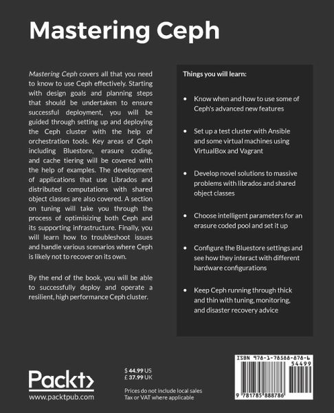 Deep dive into the unified, distributed storage system in order to provide excellent performance Key Features Leverage Ceph's advanced features such as erasure coding, tiering, and Bluestore Solve large-scale problems with Ceph as a tool by understanding its strengths and weaknesses to develop the best solutions A practical guide that covers engaging use cases to help you use advanced features of Ceph effectively Book Description Mastering Ceph covers all that you need to know to use Ceph effectively. Starting with design goals and planning steps that should be undertaken to ensure successful deployments, you will be guided through to setting up and deploying the Ceph cluster, with the help of orchestration tools. Key areas of Ceph including Bluestore, Erasure coding and cache tiering will be covered with help of examples. Development of applications which use Librados and Distributed computations with shared object classes are also covered. A section on tuning will take you through the process of optimisizing both Ceph and its supporting infrastructure. Finally, you will learn to troubleshoot issues and handle various scenarios where Ceph is likely not to recover on its own. By the end of the book, you will be able to successfully deploy and operate a resilient high performance Ceph cluster. What you will learn Know when and how to use some of Ceph's advanced new features Set up a test cluster with Ansible and some virtual machines using VirtualBox and Vagrant Develop novel solutions to massive problems with librados and shared object classes. Choose intelligent parameters for an erasure coded pool and set it up. Configure the Bluestore settings and see how they interact with different hardware configurations. Keep Ceph running through thick and thin with tuning, monitoring and disaster recovery advice.