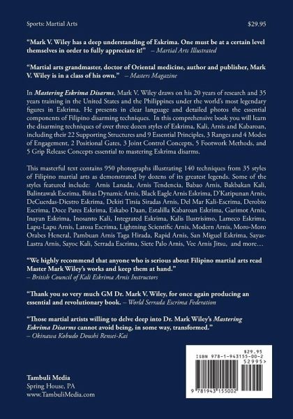 In Mastering Eskrima Disarms you will learn the disarming techniques of over 30 different styles of Eskrima, Kali, Arnis and Kabaroan, including 22 Supporting Structures and 9 Essential Principles of Effective Disarms, the 3 Ranges and 4 Modes of Engagement, 2 Positional Gates, 3 Joint Control Concepts, 5 Footwork Methods, and 5 Grip Release Concepts most essential to mastering Eskrima disarms. This masterful text contains 935 photographs illustrating 135 techniques from 33 styles of Filipino martial arts as demonstrated by dozens of its greatest legends. Some of the styles featured include: Arnis Lanada, Arnis Tendencia, Babao Arnis, Bakbakan Kali, Balintawak Escrima, Biñas Dynamic Arnis,Black Eagle Arnis Eskrima, D'Katipunan Arnis, DeCuerdas-Diestro Eskrima, Dekiti Tirsia Siradas Arnis, Del Mar Kali-Escrima, Derobio Escrima, Doce Pares Multi Style Eskrima, Eskabo Daan, Estalilla Kabaroan Eskrima, Garimot Arnis, Inayan Eskrima, Inosanto Kali, Integrated Eskrima, Kalis Ilustrisimo, Lameco Eskrima, Lapu-Lapu Arnis, Latosa Escrima, Lightning Scientific Arnis, Modern Arnis, Moro-Moro Orabes Heneral, Pambuan Arnis, Rapid Arnis, San Miguel Eskrima, Sayas-Lastra Arnis, Sayoc Kali, Serrada Escrima, Siete Palo Arnis, Vee Arnis Jitsu, and more...