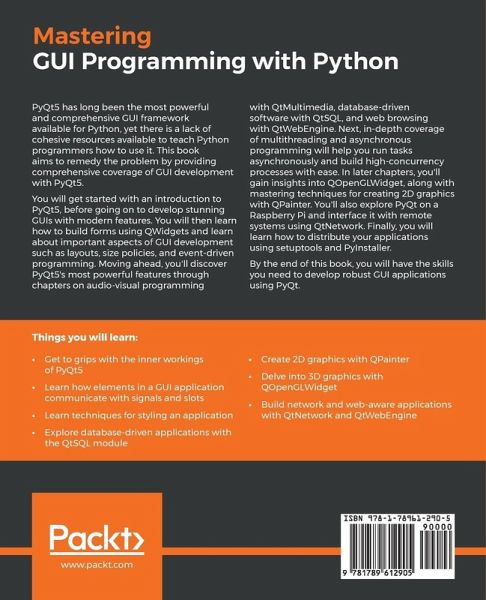 An advanced guide to creating powerful high-performance GUIs for modern, media-rich applications in various domains such as business and game development Key Features:Gain comprehensive knowledge of Python GUI development using PyQt 5.12 Explore advanced topics including multithreaded programming, 3D animation, and SQL databases Build cross-platform GUIs for Windows, macOS, Linux, and Raspberry Pi Book Description: PyQt5 has long been the most powerful and comprehensive GUI framework available for Python, yet there is a lack of cohesive resources available for Python programmers to learn how to use it. This book will be your comprehensive guide to exploring GUI development with PyQt5. You will get started with an introduction to PyQt5, before going on to develop stunning GUIs with modern features. You will learn how to build forms using QWidgets and delve into important aspects of GUI development such as layouts, size policies, and event-driven programming. Moving ahead, you'll discover PyQt5's most powerful features through chapters on audio-visual programming with QtMultimedia, database-driven software with QtSQL, and web browsing with QtWebEngine. Next, in-depth coverage of multithreading and asynchronous programming will help you run tasks asynchronously and build high-concurrency processes with ease. In later chapters, you'll gain insights into QOpenGLWidget, along with mastering techniques for creating 2D graphics with QPainter. You'll also explore PyQt on a Raspberry Pi and interface it with remote systems using QtNetwork. Finally, you will learn how to distribute your applications using setuptools and PyInstaller. By the end of this book, you will have the skills you need to develop robust GUI applications using PyQt. What You Will Learn:Get to grips with the inner workings of PyQt5 Understand how elements in a GUI application communicate with signals and slots Study techniques for styling an application Explore database-driven applications with the QtSQL module Create 2D graphics with QPainter Delve into 3D graphics with QOpenGLWidget Build network and web-aware applications with QtNetwork and QtWebEngine Who this book is for: This book is for programmers who want to create attractive, functional, and powerful GUIs using the Python language. You'll also find this book useful if you are a student, professional, or anyone who wants to start exploring GUIs. Although prior knowledge of the Python language is assumed, experience with PyQt, Qt, or GUI programming is not required.