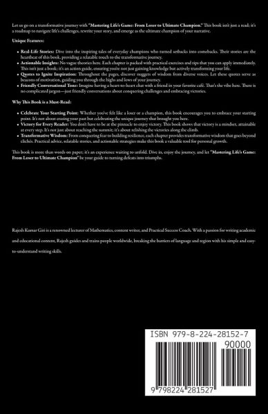 Let us go on a transformative journey with "Mastering Life's Game: From Loser to Ultimate Champion." This book isn't just a read; it's a roadmap to navigate life's challenges, rewrite your story, and emerge as the ultimate champion of your narrative. Unique Features:Real-Life Stories: Dive into the inspiring tales of everyday champions who turned setbacks into comebacks. Their stories are the heartbeat of this book, providing a relatable touch to the transformative journey. Actionable Insights: No vague theories here. Each chapter is packed with practical exercises and tips that you can apply immediately. This isn't just a book; it's an action guide, ensuring you're not just gaining knowledge but actively transforming your life. Quotes to Ignite Inspiration: Throughout the pages, discover nuggets of wisdom from diverse voices. Let these quotes serve as beacons of motivation, guiding you through the highs and lows of your journey. Friendly Conversational Tone: Imagine having a heart-to-heart chat with a friend in your favorite café. That's the vibe here. There is no complicated jargon-just friendly conversations about conquering challenges and embracing victories. Why This Book is a Must-Read:Celebrate Your Starting Point: Whether you've felt like a loser or a champion, this book encourages you to embrace your starting point. It's not about erasing your past but celebrating the unique journey that brought you here. Victory for Every Reader: You don't have to be at the pinnacle to enjoy victory. This book shows that victory is a mindset, attainable at every step. It's not just about reaching the summit; it's about relishing the victories along the climb. Transformative Wisdom: From conquering fear to building resilience, each chapter provides transformative wisdom that goes beyond clichés. Practical advice, relatable stories, and actionable strategies make this book a valuable tool for personal growth. This book is more than words on paper; it's an experience waiting to unfold. Dive in, enjoy the journey, and let "Mastering Life's Game: From Loser to Ultimate Champion" be your guide to turning defeats into triumphs.