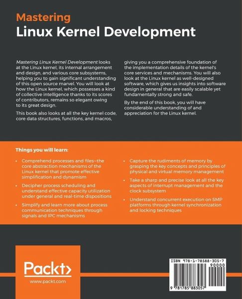 Explore Implementation of core kernel subsystems Key FeaturesMaster the design, components, and structures of core kernel subsystems Explore kernel programming interfaces and related algorithms under the hood Completely updated material for the 4.12.10 kernel Book Description Mastering Linux Kernel Development looks at the Linux kernel, its internal arrangement and design, and various core subsystems, helping you to gain significant understanding of this open source marvel. You will look at how the Linux kernel, which possesses a kind of collective intelligence thanks to its scores of contributors, remains so elegant owing to its great design. This book also looks at all the key kernel code, core data structures, functions, and macros, giving you a comprehensive foundation of the implementation details of the kernel's core services and mechanisms. You will also look at the Linux kernel as well-designed software, which gives us insights into software design in general that are easily scalable yet fundamentally strong and safe. By the end of this book, you will have considerable understanding of and appreciation for the Linux kernel. What you will learnComprehend processes and files-the core abstraction mechanisms of the Linux kernel that promote effective simplification and dynamism Decipher process scheduling and understand effective capacity utilization under general and real-time dispositions Simplify and learn more about process communication techniques through signals and IPC mechanisms Capture the rudiments of memory by grasping the key concepts and principles of physical and virtual memory management Take a sharp and precise look at all the key aspects of interrupt management and the clock subsystem Understand concurrent execution on SMP platforms through kernel synchronization and locking techniques Who this book is for: ¿If you are a kernel programmer with a knowledge of kernel APIs and are looking to build a comprehensive understanding, and eager to explore the implementation, of kernel subsystems, this book is for you. It sets out to unravel the underlying details of kernel APIs and data structures, piercing through the complex kernel layers and gives you the edge you need to take your skills to the next level.