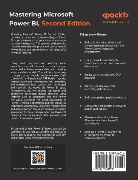 Plan, design, develop, and manage robust Power BI solutions to generate meaningful insights and make data-driven decisions. Purchase of the print or Kindle book includes a free eBook in the PDF format.Key FeaturesMaster the latest dashboarding and reporting features of Microsoft Power BI Combine data from multiple sources, create stunning visualizations and publish Power BI apps to thousands of users Get the most out of Microsoft Power BI with real-world use cases and examples Book Description Mastering Microsoft Power BI, Second Edition, provides an advanced understanding of Power BI to get the most out of your data and maximize business intelligence. This updated edition walks through each essential phase and component of Power BI, and explores the latest, most impactful Power BI features. Using best practices and working code examples, you will connect to data sources, shape and enhance source data, and develop analytical data models. You will also learn how to apply custom visuals, implement new DAX commands and paginated SSRS-style reports, manage application workspaces and metadata, and understand how content can be staged and securely distributed via Power BI apps. Furthermore, you will explore top report and interactive dashboard design practices using features such as bookmarks and the Power KPI visual, alongside the latest capabilities of Power BI mobile applications and self-service BI techniques. Additionally, important management and administration topics are covered, including application lifecycle management via Power BI pipelines, the on-premises data gateway, and Power BI Premium capacity. By the end of this Power BI book, you will be confident in creating sustainable and impactful charts, tables, reports, and dashboards with any kind of data using Microsoft Power BI.What you will learnBuild efficient data retrieval and transformation processes with the Power Query M language and dataflows Design scalable, user-friendly DirectQuery, import, and composite data models Create basic and advanced DAX measures Add ArcGIS Maps to create interesting data stories Build pixel-perfect paginated reports Discover the capabilities of Power BI mobile applications Manage and monitor a Power BI environment as a Power BI administrator Scale up a Power BI solution for an enterprise via Power BI Premium capacity Who this book is for Business Intelligence professionals and intermediate Power BI users looking to master Power BI for all their data visualization and dashboarding needs will find this book useful. An understanding of basic BI concepts is required and some familiarity with Microsoft Power BI will be helpful to make the most out of this book.Table of ContentsPlanning Power BI Projects Preparing Data sources Connecting to Sources and Transforming Data with M Designing Import, DirectQuery, and Composite Data Models Developing DAX Measures and Security Roles Planning Power BI Reports Creating and Formatting Visualizations Applying Advanced Analytics Designing Dashboards Managing Workspaces and Content Managing the On-Premises Data Gateway Deploying Paginated Reports Creating Power BI Apps and Content Distribution Administering Power BI for an Organization Building Enterprise BI with Power BI Premium