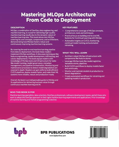 Harness the power of MLOps for managing real time machine learning project cycle ¿MLOps, a combination of DevOps, data engineering, and machine learning, is crucial for delivering high-quality machine learning results due to the dynamic nature of machine learning data. This book delves into MLOps, covering its core concepts, components, and architecture, demonstrating how MLOps fosters robust and continuously improving machine learning systems. By covering the end-to-end machine learning pipeline from data to deployment, the book helps readers implement MLOps workflows. It discusses techniques like feature engineering, model development, A/B testing, and canary deployments. The book equips readers with knowledge of MLOps tools and infrastructure for tasks like model tracking, model governance, metadata management, and pipeline orchestration. Monitoring and maintenance processes to detect model degradation are covered in depth. Readers can gain skills to build efficient CI/CD pipelines, deploy models faster, and make their ML systems more reliable, robust and production-ready. Overall, the book is an indispensable guide to MLOps and its applications for delivering business value through continuous machine learning and AI. WHAT YOU WILL LEARN ¿ Architect robust MLOps infrastructure with components like feature stores. ¿ Leverage MLOps tools like model registries, metadata stores, pipelines. ¿ Build CI/CD workflows to deploy models faster and continually. ¿ Monitor and maintain models in production to detect degradation. ¿ Create automated workflows for retraining and updating models in production. WHO THIS BOOK IS FOR Machine learning specialists, data scientists, DevOps professionals, software development teams, and all those who want to adopt the DevOps approach in their agile machine learning experiments and applications. Prior knowledge of machine learning and Python programming is desired.