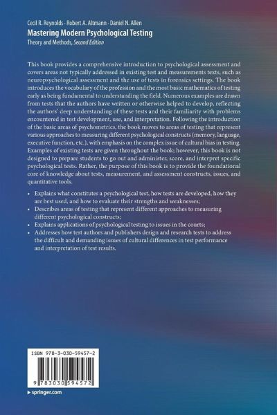 This book provides a comprehensive introduction to psychological assessment and covers areas not typically addressed in existing test and measurements texts, such as neuropsychological assessment and the use of tests in forensics settings. The book introduces the vocabulary of the profession and the most basic mathematics of testing early as being fundamental to understanding the field. Numerous examples are drawn from tests that the authors have written or otherwise helped to develop, reflecting the authors' deep understanding of these tests and their familiarity with problems encountered in test development, use, and interpretation. Following the introduction of the basic areas of psychometrics, the book moves to areas of testing that represent various approaches to measuring different psychological constructs (memory, language, executive function, etc.), with emphasis on the complex issue of cultural bias in testing. Examples of existing tests are given throughout the book; however, this book is not designed to prepare students to go out and administer, score, and interpret specific psychological tests. Rather, the purpose of this book is to provide the foundational core of knowledge about tests, measurement, and assessment constructs, issues, and quantitative tools.