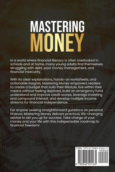 In a world where financial literacy is often overlooked in schools and at home, many young adults find themselves struggling with debt, poor money management, and financial insecurity.In a world where financial literacy is often overlooked in schools and at home, many young adults find themselves struggling with debt, poor money management, and financial insecurity. Mastering Money is the essential guide to breaking free from financial stress and building a secure future. Drawing from personal experiences and real-world financial principles, readers are walked through the fundamental skills needed to manage money wisely-from budgeting and mindful spending to debt management, credit scores, and investing for the future. Whether you're just starting out in your career, trying to pay off debt, or preparing for retirement, this book provides practical strategies and step-by-step exercises to help you create a solid financial foundation. With clear explanations, hands-on worksheets, and actionable insights, Mastering Money empowers readers to: ✅ Create a budget that works for their lifestyle ✅ Live within their means without feeling deprived ✅ Build an emergency fund and avoid debt traps ✅ Understand credit scores and how to improve them ✅ Leverage the power of investing and compound interest ✅ Develop multiple income streams for financial independence If you've ever wished for a straightforward guide to mastering personal finance, this is the book for you. No complex jargon, no unrealistic promises-just practical, life-changing financial advice that will set you up for success. Take charge of your money. Take charge of your life. Mastering Money is your roadmap to financial freedom!