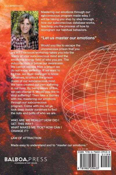 Mastering our emotions through our subconscious program made easy. I will be taking you step by step through how our subconscious database works, teaching you the process of how to reprogram our habitual behaviors. "Let us master our emotions" Would you like to escape the unconscious prison that you are in? This book/workshop takes you into the reality of your subconscious mind and the emotional energy field of who you are. The subconscious is below our awareness. We cannot escape from a prison we do not know we are in. If we want to be free, we must really get to know ourselves, to unlock the prison doors of our subconscious mind. We have created our own suffering in our lives. By being aware of this, we can change it. Would you like to stop suffering? Then take a journey with me, mastering our emotions through our subconscious program. Come with me, let us look deep inside ourselves to find the nuts and bolts of who we are. WHO ARE WE REALLY? HOW DID I GET THIS WAY? WHAT MAKES ME TICK? HOW CAN I CHANGE IT? LAW OF ATTRACTION Made easy to understand and to "master our emotions."