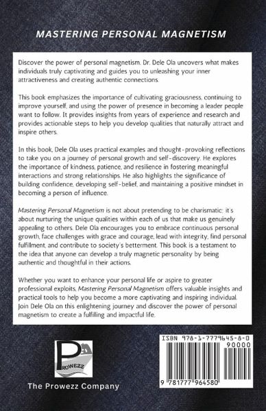 Discover the power of personal magnetism. Dr. Dele Ola uncovers what makes individuals truly captivating and guides you to unleashing your inner attractiveness and creating authentic connections. This book emphasizes the importance of cultivating graciousness, continuing to improve yourself, and using the power of presence in becoming a leader people want to follow. It provides insights from years of experience and research and provides actionable steps to help you develop qualities that naturally attract and inspire others. In this book, Dele Ola uses practical examples and thought-provoking reflections to take you on a journey of personal growth and self-discovery. He explores the importance of kindness, patience, and resilience in fostering meaningful interactions and strong relationships. He also highlights the significance of building confidence, developing self-belief, and maintaining a positive mindset in becoming a person of influence. Mastering Personal Magnetism is not about pretending to be charismatic; it's about nurturing the unique qualities within each of us that make us genuinely appealing to others. Dele Ola encourages you to embrace continuous personal growth, face challenges with grace and courage, lead with integrity, find personal fulfillment, and contribute to society's betterment. This book is a testament to the idea that anyone can develop a truly magnetic personality by being authentic and thoughtful in their actions. Whether you want to enhance your personal life or aspire to greater professional exploits, Mastering Personal Magnetism offers valuable insights and practical tools to help you become a more captivating and inspiring individual. Join Dele Ola on this enlightening journey and discover the power of personal magnetism to create a fulfilling and impactful life.