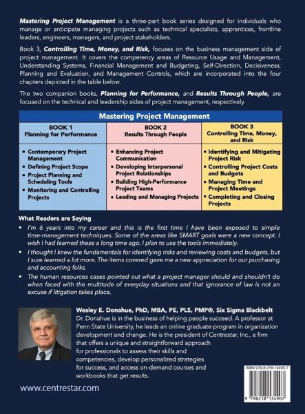 Mastering Project Management is a three-part book series designed for individuals who manage or anticipate managing workplace projects such as technical specialists, apprentices, frontline leaders, engineers, managers, and project stakeholders. This Book 3, Controlling Time, Money, and Risk, focuses on the business management side of project management. This book aims to help you effectively manage and control your projects. The book also discusses how to measure project performance and adjust as needed to ensure your projects are completed on time and within budget. Effective business management is critical to the success of any project. By mastering the skills and techniques discussed in this book, you can effectively control the time, money, and risk associated with your projects, leading to better outcomes for your organization. This book also focuses on the competency areas of Resource Usage and Management, Understanding Systems, Financial Management and Budgeting, Self-Direction, Decisiveness, Planning and Evaluation, and Management Controls, which are incorporated into the four chapters outlined below. Book 3 Controlling Time, Money, and Risk · Identifying and Mitigating Project Risk · Controlling Project Costs and Budgets · Managing Time and Project Meetings · Completing and Closing Projects The two companion books, Planning for Performance, and Results Through People, are focused on the technical and leadership sides of project management, respectively. Although the series is directed toward individuals, faculty teaching in universities and community college programs, as well as trainers in organizations will find it useful as a text or guide to bridge theory and practice. People in organizations who just want to learn and study more about project management can use the self-paced guidebooks for workshops and seminars or learn-at-lunch programs. As you proceed through the content and associated learning activities, it is helpful to apply what you learn to projects that you are familiar with. This will help you better understand the concepts, and indicate areas for potential organizational improvement. This MASTERNING PROJECT MANAGEMENT-Controlling Time, Money, and Risk guidebook focuses primarily on all the competency areas associated with the Resource Management competency cluster or domain. For more information or visit: www.centrestar.com
