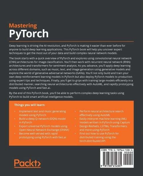 Master advanced techniques and algorithms for deep learning with PyTorch using real-world examples Key Features - Understand how to use PyTorch 1.x to build advanced neural network models - Learn to perform a wide range of tasks by implementing deep learning algorithms and techniques - Gain expertise in domains such as computer vision, NLP, Deep RL, Explainable AI, and much more Book Description Deep learning is driving the AI revolution, and PyTorch is making it easier than ever before for anyone to build deep learning applications. This PyTorch book will help you uncover expert techniques to get the most out of your data and build complex neural network models. The book starts with a quick overview of PyTorch and explores using convolutional neural network (CNN) architectures for image classification. You'll then work with recurrent neural network (RNN) architectures and transformers for sentiment analysis. As you advance, you'll apply deep learning across different domains, such as music, text, and image generation using generative models and explore the world of generative adversarial networks (GANs). You'll not only build and train your own deep reinforcement learning models in PyTorch but also deploy PyTorch models to production using expert tips and techniques. Finally, you'll get to grips with training large models efficiently in a distributed manner, searching neural architectures effectively with AutoML, and rapidly prototyping models using PyTorch and fast.ai. By the end of this PyTorch book, you'll be able to perform complex deep learning tasks using PyTorch to build smart artificial intelligence models. What you will learn - Implement text and music generating models using PyTorch - Build a deep Q-network (DQN) model in PyTorch - Export universal PyTorch models using Open Neural Network Exchange (ONNX) - Become well-versed with rapid prototyping using PyTorch with fast.ai - Perform neural architecture search effectively using AutoML - Easily interpret machine learning (ML) models written in PyTorch using Captum - Design ResNets, LSTMs, Transformers, and more using PyTorch - Find out how to use PyTorch for distributed training using the torch.distributed API Who this book is for This book is for data scientists, machine learning researchers, and deep learning practitioners looking to implement advanced deep learning paradigms using PyTorch 1.x. Working knowledge of deep learning with Python programming is required. Table of Contents - Overview of Deep Learning Using PyTorch - Combining CNNs and LSTMs - Deep CNN Architectures - Deep Recurrent Model Architectures - Hybrid Advanced Models - Music and Text Generation with PyTorch - Neural Style Transfer - Deep Convolutional GANs - Deep Reinforcement Learning - Operationalizing Pytorch Models into Production - Distributed Training - PyTorch and AutoML - PyTorch and Explainable AI - Rapid Prototyping with PyTorch