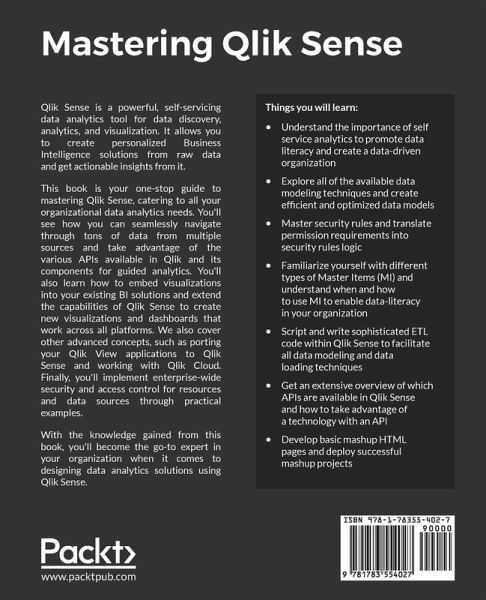 Master the capabilities of Qlik Sense to design and deploy solutions that address all the Business Intelligence needs of your organization Key Features:Create compelling dashboards and visualizations with your data by leveraging Qlik Sense's self-service model Perform data loading and model efficient solutions with faster performance and better governance Master Qlik Sense's APIs and develop powerful mashups and fantastic extensions for visualizations and other components that run across all platforms Book Description: Qlik Sense is a powerful, self-servicing Business Intelligence tool for data discovery, analytics and visualization. It allows you to create personalized Business Intelligence solutions from raw data and get actionable insights from it. This book is your one-stop guide to mastering Qlik Sense, catering to all your organizational BI needs. You'll see how you can seamlessly navigate through tons of data from multiple sources and take advantage of the various APIs available in Qlik and its components for guided analytics. You'll also learn how to embed visualizations into your existing BI solutions and extend the capabilities of Qlik Sense to create new visualizations and dashboards that work across all platforms. We also cover other advanced concepts such as porting your Qlik View applications to Qlik Sense,and working with Qlik Cloud. Finally, you'll implement enterprise-wide security and access control for resources and data sources through practical examples. With the knowledge gained from this book, you'll have become the go-to expert in your organization when it comes to designing BI solutions using Qlik Sense. What You Will Learn:Understand the importance of self-service analytics and the IKEA-effect Explore all the available data modeling techniques and create efficient and optimized data models Master security rules and translate permission requirements into security rule logic Familiarize yourself with different types of Master Key Item(MKI) and know how and when to use MKI. Script and write sophisticated ETL code within Qlik Sense to facilitate all data modeling and data loading techniques Get an extensive overview of which APIs are available in Qlik Sense and how to take advantage of a technology with an API Develop basic mashup HTML pages and deploy successful mashup projects Who this book is for: This book is for Business Intelligence professionals and Data Analysts who want to become experts in using Qlik Sense. If you have extensively used QlikView in the past and are looking to transition to Qlik Sense, this book will also help you. A fundamental understanding of how Qlik Sense works and its features is all you need to get started with this book.
