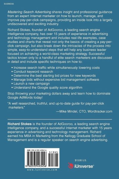 Mastering Search Advertising shares insight and professional guidance from an expert Internet marketer on how to launch, manage and improve already-existing pay-per-click campaigns, providing an inside look into a largely undiscovered and exciting industry. Richard Stokes, founder of AdGooroo, a leading search engine intelligence company, has over 15 years of experience in advertising and technology management and includes real-life examples, case studies and charts that reveal not only the basics of creating a pay-per-click campaign, but also break down the intricacies of the process into simple, easy-to-understand steps that will help any business leader focused on achieving a world-class marketing strategy. Successful tactics known only to a handful of elite search marketers are discussed in detail and include specific techniques on how to: Increase search traffic while simultaneously lowering costs Conduct keyword research Determine the best starting bid prices for new keywords Manage bids without expensive bid management software Launch a new campaign Understand the Google quality score algorithm Stop throwing your marketing dollars away and learn how to dominate Google AdWords today! "A well researched, truthful, and up-to-date guide for pay-per-click marketers." Mike Mindel, CTO, Wordtracker.com