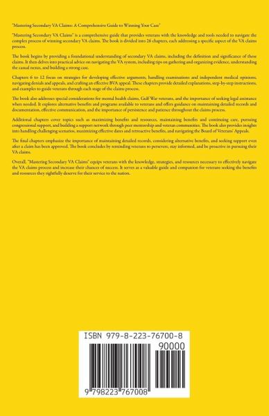 "Mastering Secondary VA Claims: A Comprehensive Guide to Winning Your Case" "Mastering Secondary VA Claims" is a comprehensive guide that provides veterans with the knowledge and tools needed to navigate the complex process of winning secondary VA claims. The book is divided into 26 chapters, each addressing a specific aspect of the VA claims process. The book begins by providing a foundational understanding of secondary VA claims, including the definition and significance of these claims. It then delves into practical advice on navigating the VA system, including tips on gathering and organizing evidence, understanding the casual nexus, and building a strong case. Chapters 6 to 12 focus on strategies for developing effective arguments, handling examinations and independent medical opinions, navigating denials and appeals, and crafting an effective BVA appeal. These chapters provide detailed explanations, step-by-step instructions, and examples to guide veterans through each stage of the claims process. The book also addresses special considerations for mental health claims, Gulf War veterans, and the importance of seeking legal assistance when needed. It explores alternative benefits and programs available to veterans and offers guidance on maintaining detailed records and documentation, effective communication, and the importance of persistence and patience throughout the claims process. Additional chapters cover topics such as maximizing benefits and resources, maintaining benefits and continuing care, pursuing congressional support, and building a support network through peer mentorship and veteran communities. The book also provides insights into handling challenging scenarios, maximizing effective dates and retroactive benefits, and navigating the Board of Veterans' Appeals. The final chapters emphasize the importance of maintaining detailed records, considering alternative benefits, and seeking support even after a claim has been approved. The book concludes by reminding veterans to persevere, stay informed, and be proactive in pursuing their VA claims. Overall, "Mastering Secondary VA Claims" equips veterans with the knowledge, strategies, and resources necessary to effectively navigate the VA claims process and increase their chances of success. It serves as a valuable guide and companion for veterans seeking the benefits and resources they rightfully deserve for their service to the nation.