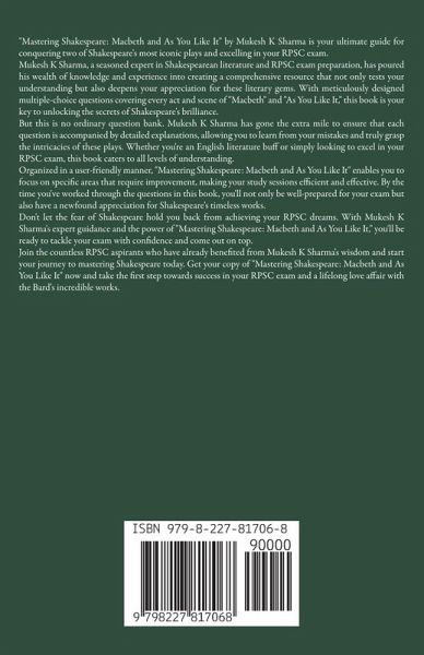 Hey there, fellow Shakespeare enthusiasts and RPSC aspirants! I'm Mukesh K Sharma, and I'm thrilled to present to you my labor of love, "Mastering Shakespeare: MCQs for RPSC Exams." As someone who has been in your shoes, I know firsthand how daunting it can be to prepare for the RPSC exam, especially when it comes to tackling the works of the Bard himself. That's why I've poured my heart and soul into creating this book, which is designed to be your ultimate companion on your journey to mastering two of Shakespeare's most iconic plays, "Macbeth" and "As You Like It." I've spent countless hours researching, analyzing, and crafting questions that not only test your knowledge but also help you dive deeper into these literary gems. In this book, you'll find meticulously designed multiple-choice questions that cover every act and scene of both plays. But don't worry, I haven't just thrown a bunch of questions at you and left you hanging! I've made sure to include detailed explanations for each answer, so you can understand the reasoning behind them and learn from your mistakes. Whether you're an English literature buff or simply looking to ace your RPSC exam, this book is your key to unlocking the secrets of Shakespeare's genius. I've organized the chapters in a way that makes it easy for you to navigate and focus on specific areas that need improvement. And trust me, by the time you've worked through all the questions in this book, you'll be a Shakespeare pro! So, what are you waiting for? Join me on this exciting adventure through the world of "Macbeth" and "As You Like It," and let's make your RPSC exam preparation a breeze. I promise you, with "Mastering Shakespeare: MCQs for RPSC Exams" by your side, you'll not only crush your exam but also develop a lifelong appreciation for the Bard's timeless works. Let's do this together! Cheers, Mukesh K Sharma