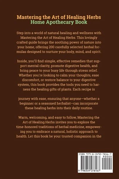 Master the Art of Healing Herbs for Mental Clarity, Digestive Health, and Stress Relief Mastering the Art of Healing Herbs is the ultimate guide to over 200 herbal formulas for enhancing mental clarity, digestive health, and stress relief. This book empowers you to harness the natural healing power of herbs to create remedies tailored to your body's needs. Whether you're boosting focus, easing digestive discomfort, or relieving stress, this book offers natural, holistic solutions for well-being. With clear instructions, you'll learn to craft teas, tinctures, and more using trusted, centuries-old ingredients. Gain the confidence to integrate plant-based remedies into your daily life for long-lasting health and vitality. Why You Should Buy This Book: Comprehensive Guide: Over 200 herbal formulas to address mental clarity, digestive health, and stress relief. Tailored Remedies: Specific solutions for focus, digestion, and stress with easy-to-follow instructions. Natural Stress Relief: Use herbs to ease anxiety, calm your nervous system, and promote relaxation. Gut Health: Discover herbs that support digestion and alleviate common digestive issues naturally. Craft Your Remedies: Build your own herbal collection, empowering you to take control of your health. Mastering the Art of Healing Herbs provides you with the tools to create healing remedies at home, supporting your physical and emotional health with nature's best.