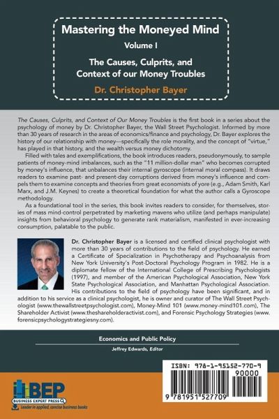 This book invites readers to consider, for themselves, stories of mass mind-control perpetrated by marketing mavens who utilize (and perhaps manipulate) insights from behavioral psychology to generate rank materialism, manifested in ever-increasing consumption, palatable to the public. The Causes, Culprits, and Context of Our Money Troubles is the first book in a series about the psychology of money by Dr. Christopher Bayer, the Wall Street Psychologist. Informed by more than 30 years of research in the areas of economics/finance and psychology, Dr. Bayer explores the history of our relationship with money-specifically the role morality, and the concept of "virtue," has played in that history, and the wealth versus money dichotomy. Filled with tales and exemplifications, the book introduces readers, pseudonymously, to sample patients of money -mind imbalances, such as the "11 million-dollar man" who becomes corrupted by money's influence, that unbalances their internal gyroscope (internal moral compass). It draws readers to examine past- and present-day corruptions derived from money's influence and compels them to examine concepts and theories from great economists of yore (e.g., Adam Smith, Karl Marx, and J.M. Keynes) to create a theoretical foundation for what the author calls a Gyroscope methodology. As a foundational tool in the series, this book invites readers to consider, for themselves, stories of mass mind-control perpetrated by marketing mavens who utilize (and perhaps manipulate) insights from behavioral psychology to generate rank materialism, manifested in ever-increasing consumption, palatable to the public.