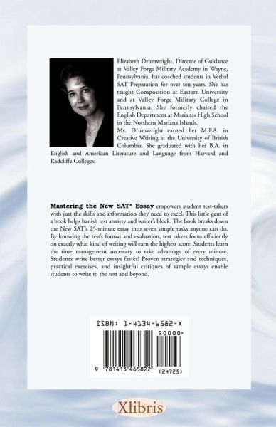 Mastering the New SAT* Essay empowers student test-takers with just the skills and information they need to excel. This little gem of a book helps banish test anxiety and writer¡¿s block. The book breaks down the New SAT¡¿s 25-minute essay into seven simple tasks anyone can do. Each task is manageable and assigned a precise number of minutes. By knowing the test¡¿s format and evaluation, test takers focus efficiently on exactly what kind of writing will earn the highest score. Students learn to:
