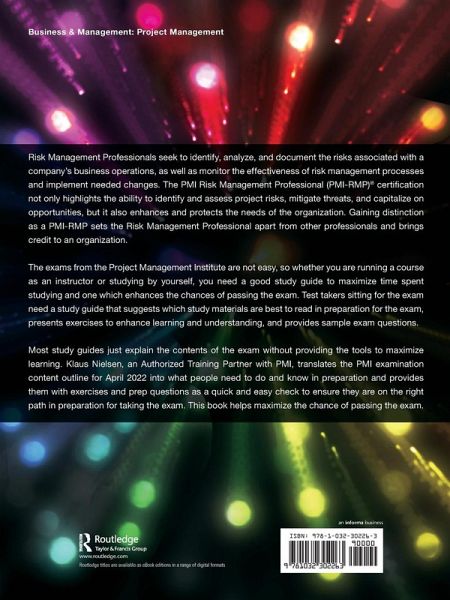Preface. Acknowledgments. About the Author. Introduction. 1 Pretest Knowledge Assessment. 2 PMI-RMP Certification Overview. 3 Study Tips (What to Read and Do) and How to Pass the Exam. 4 Domain I: Risk Strategy and Planning. 5 Domain II: Risk Identification. 6 Domain III: Risk Analysis. 7 Domain IV: Risk Response. 8 Domain V: Monitor and Close Risks. 9 Full Practice Exam 1. 10 Full Practice Exam 2. Appendix A: Agile Mindset and Principles. Appendix B: Scrum and Continuous Risk Management in Scrum. Appendix C: Hybrid Project and Risk Management. Appendix D: PMI Code of Ethics and Professional Conduct. Appendix E: Cross-Reference Guide. Appendix F: Tasks Placemat. Source list of Terms and Acronyms. References and Additional Readings. Index.
