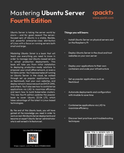 Your one-stop resource to learn, configure and use Ubuntu 22.04 for your day-to-day operations and deployments. Purchase of the print or Kindle book includes a free eBook in PDF format.Key FeaturesGet well-versed with newly added features in Ubuntu 22.04 Master the art of installing, managing, and troubleshooting Ubuntu Server Leverage the improved performance and security-related aspects of Ubuntu Server 22.04 Book Description Ubuntu Server is taking the server world by storm - and for a good reason! The server-focused spin of Ubuntu is a stable, flexible, and powerful enterprise-class distribution of Linux with a focus on running servers both small and large. Mastering Ubuntu Server is a book that will teach you everything you need to know in order to manage real Ubuntu-based servers in actual production deployments. This book will take you from initial installation to deploying production-ready solutions to empower your small office network, or even a full data center. You'll see examples of running an Ubuntu Server in the cloud, be walked through set up popular applications (such as Nextcloud), host your own websites, and deploy network resources such as DHCP, DNS, and others. You'll also see how to containerize applications via LXD to maximize efficiency and learn how to build Kubernetes clusters. This new fourth edition updates the popular book to cover Ubuntu 22.04 LTS, which takes advantage of the latest in Linux-based technologies. By the end of this Ubuntu book, you will have gained all the knowledge you need in order to work on real-life Ubuntu Server deployments and become an expert Ubuntu Server administrator who is well versed in its feature set.What you will learnInstall Ubuntu Server on physical servers and on the Raspberry Pi Deploy Ubuntu Server in the cloud and host websites on your own server Deploy your applications to their own containers and scale your infrastructure Set up popular applications such as Nextcloud Automate deployments and configuration with Ansible to save time Containerize applications via LXD to maximize efficiency Discover best practices and troubleshooting techniques Who this book is for This book is for System Administrators, Site Reliability Engineers, DevOps professionals, enthusiasts, as well as for individuals looking to make a career change and learn the skills they'll need to work with Ubuntu servers. Prior knowledge of Ubuntu is not required but a basic understanding of basic computing concepts is assumed. Some IT administration, Linux, and shell scripting experience is preferred, although the first several chapters will bring newcomers up to speed as well.Table of ContentsDeploying Ubuntu Server Managing Users and Permissions Managing Software Packages Navigating and Essential Commands Managing Files and Directories Boosting Your Command-line Efficiency Controlling and Managing Processes Monitoring System Resources Managing Storage Volumes Connecting to Networks Setting Up Network Services Sharing and Transferring Files Managing Databases Serving Web Content Automating Server Configuration with Ansible Virtualization Running Containers Container Orchestration Deploying Ubuntu in the Cloud Automating Cloud Deployments with Terraform Securing Your Server Troubleshooting Ubuntu Servers Preventing Disasters